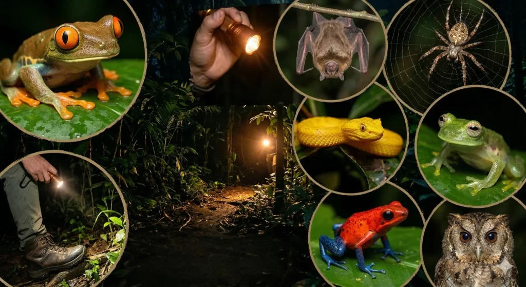 Descubre un mundo completamente nuevo cuando se oculta el sol. Ranas cristal, insectos exóticos y los misteriosos sonidos del bosque.