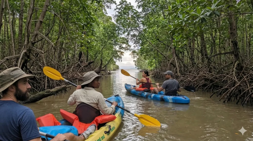 Deslízate en silencio por los tranquilos canales del manglar, un santuario lleno de monos, aves exóticas y biodiversidad fascinante.